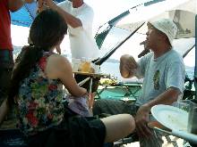 お腹も落ち着いた頃、泳ぐ人やシーカヤックで遊ぶ人、モーターボートでの遊覧等皆さんそれぞれに共有の一時を楽しんでおられました。この頃、四万十川方面から来られたイタリア人の方と日本人の女性のアベック(フランス語ですが日本語としてはもはや死語かも)さんから四万十川の手長海老と天然鮎と天然鰻の差し入れをいただき天然物の美味しさに皆さん只々驚かされるのでした。