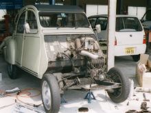 ミッション交換にはエンジンの脱着が不可欠のためフロントパネル類を外してからライトのステーやバンパーなども外します。すっかり裸にされた2CVは「私もう駄目、どうにでもして♡」状態なのです。